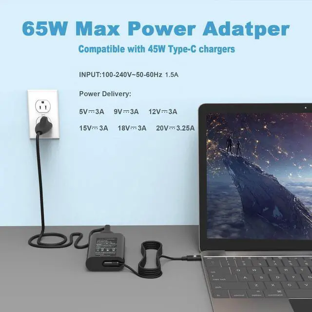 - Watt:65W.( Compatible 45W USB-C Laptop Charger)