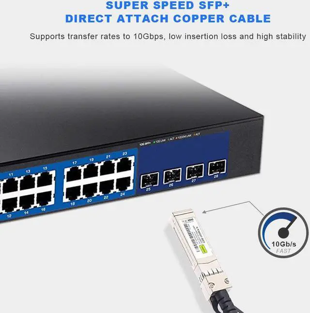 SFP+ DAC (Direct Attach Copper) passive twinax cable is suitable for very short distances transmission and offers a highly cost-effective and low power solution to connect within racks and across adjacent racks. SFP+ twinax passive cable allows for a serial data transmission up to 10.3Gb/s, which is a low cost choice for very short reach applications of 10GbE or 1-8G Fiber Channel.
