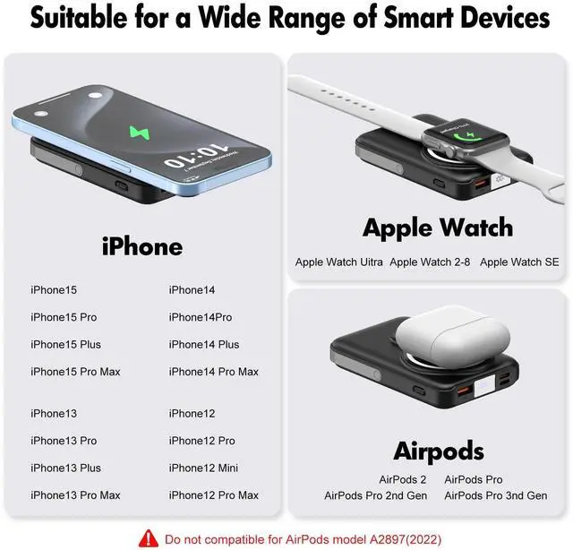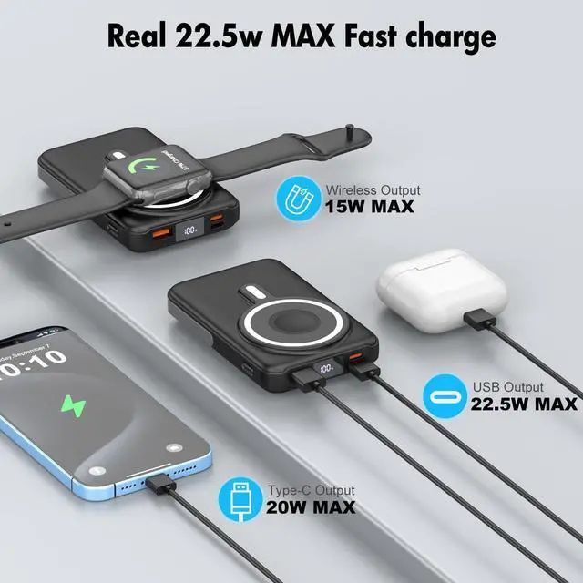 Wireless Portable Charger 10000mAh,3-in-1 Magnetic Power Bank with Built-in Cables LED Display,22.5W Fast Charging Mag-Safe Battery Pack for iPhone 15/14/13/12, Apple Watch Series, Airpods