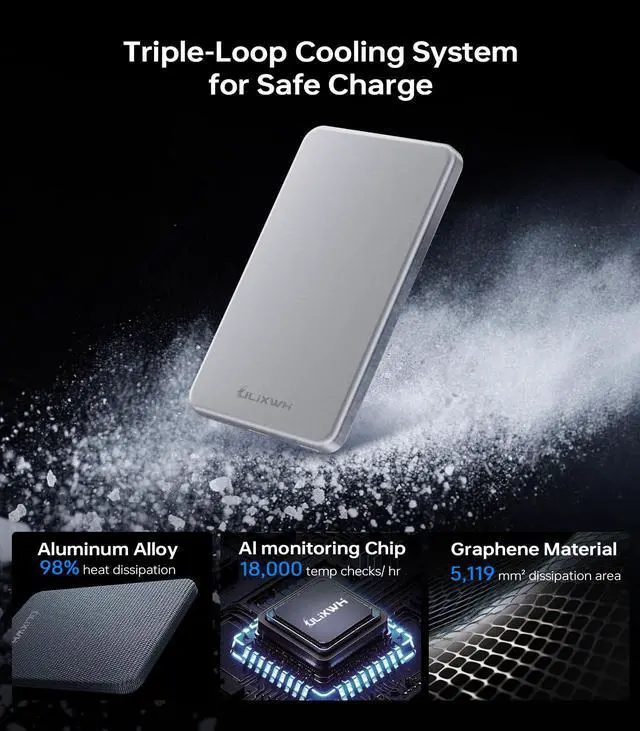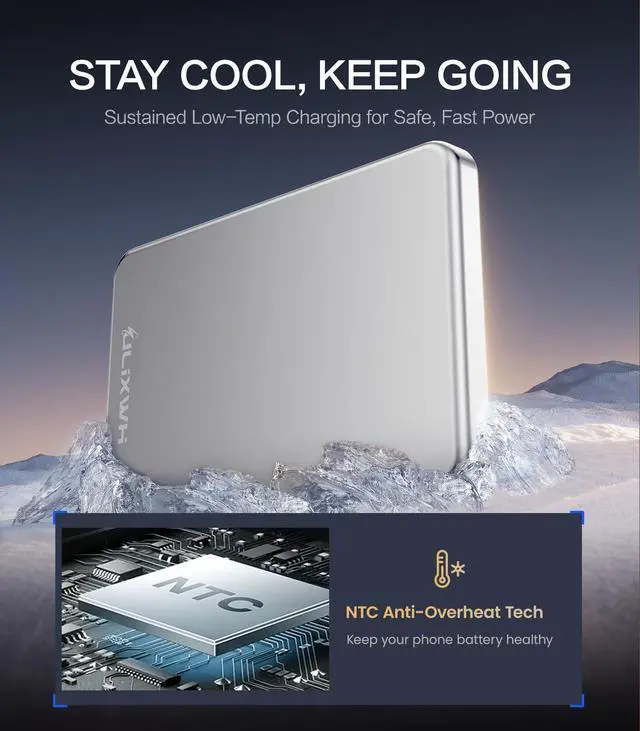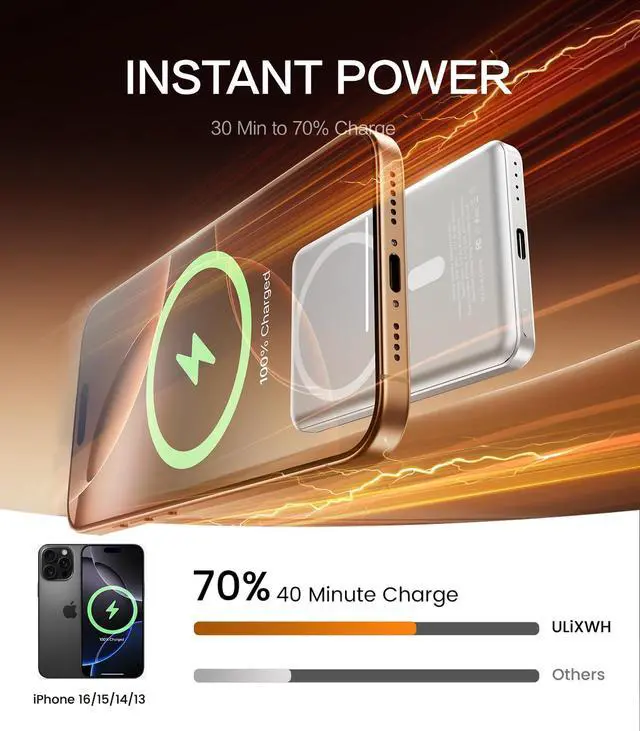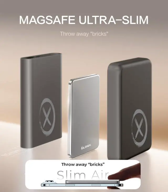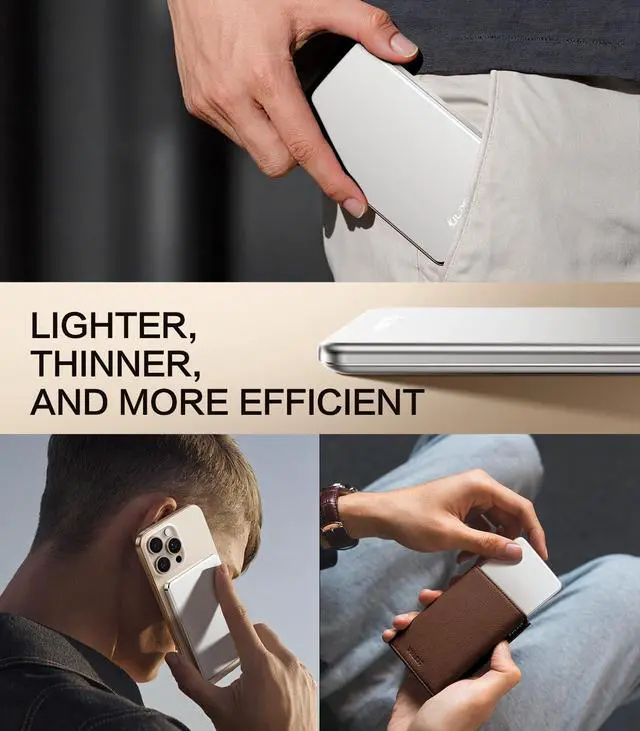 [ Ultra Slim & Lightweight Power Bank ] Only 0.4 inches thin and 0.26 lbs light, this for MagSafe-compatible power bank snaps securely to your phone, making it ultra-portable. Nearly the size of a credit card, it fits effortlessly in your pocket, purse, or travel bagensuring power is always within reach [ Fast Wireless Charging Power Bank ] Equipped with an advanced lithium-polymer battery and NTC temperature control chip, this 5000mAh power bank delivers 2x faster charging, fully powering your device in just 2 hours. Its high-efficiency energy conversion reduces power loss by 40%, keeping you connected longer [ Stay Cool & Device-Safe ] Featuring an advanced NTC cooling system, this charger dissipates heat efficiently, keeping temperatures up to 50 lower for optimal performance. Designed to protect your devices battery life, it ensures stable and efficient charging even in hot weather [ Snap & Charge Stronger Magnetic Hold ] Say goodbye to messy cables! With an enhanced 13N magnetic force, this for MagSafe power bank provides 4x stronger attachment, keeping your phone firmly in placeeven during movement or bumps. Rigorously tested to withstand 3000+ shakes while maintaining a stable charge [ Sleek & Durable ] Made of premium aluminum alloy & V-0 grade PC material, this power bank features a stylish metallic finish while ensuring long-lasting durability. Certified by UL, CE, FCC, and RoHS, it guarantees safe, reliable charging every time [ Long-Lasting Battery for Travel ] Powered by Tesla-grade lithium-polymer technology, this battery pack lasts over 1000 charge cyclesstaying powerful for up to 3 years. Perfect for weekend getaways or long trips, this high-capacity charger keeps your devices powered anywhere you go