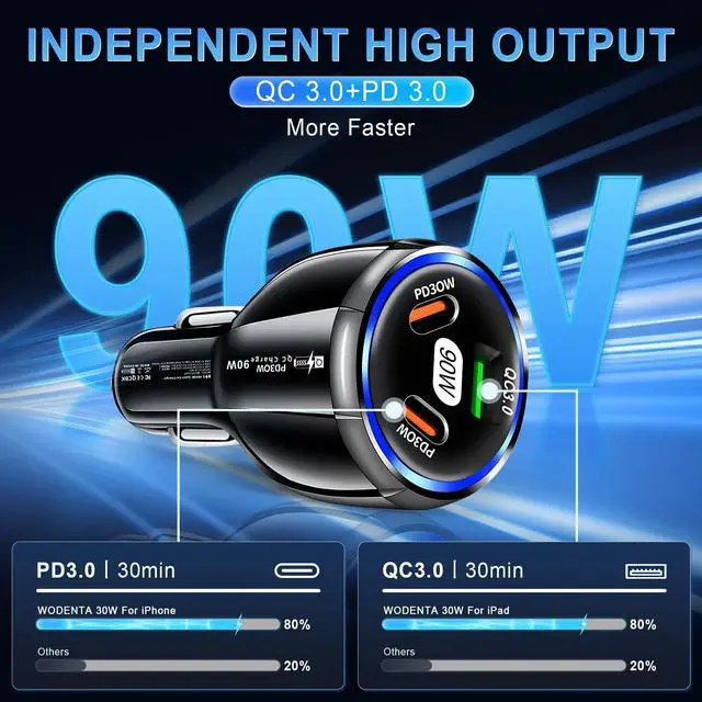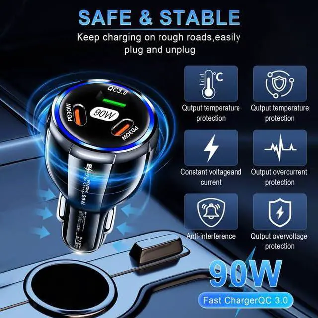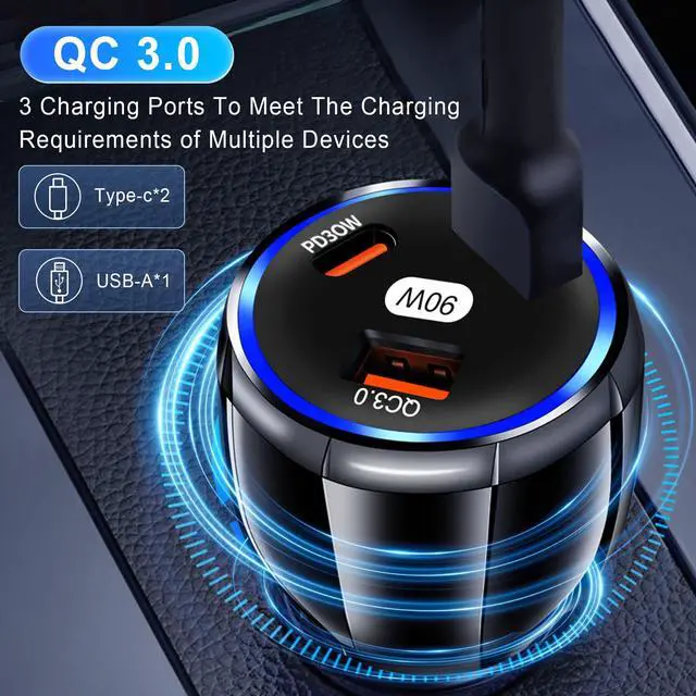 • [MULTI-PORT CAR CHARGER]: 3 USB ports including one 30W USB-A fast charging and 2 30W USB C fast charging. Charge your devices both in front and behind the car, enjoy the journey with your family.