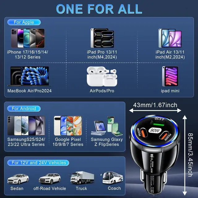 • [Versatile]: Compact design, compatible with cars, trucks or vans, etc. Suitable for iPhone Pro/Max/Mini/XS/XR/X/Plus, Samsung S/Note, Tablet PC, Car Recorder and more USB devices.