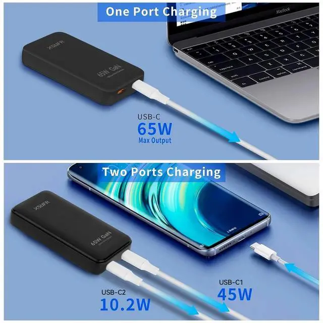 Boost productivity by keeping key devices fully charged. The 65W dual-port charger powers laptops, tablets, and phones simultaneously, ideal for work or remote setups.
