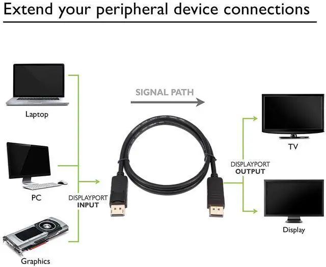 The DisplayPort Cable is an indispensable companion for your laptop or desktop equipped with DisplayPort. Extend your desktop to a second monitor for an expanded workstation, or show presentations on a projector at school or work with this cable. The combination of gold-plated connectors, bare copper conductors, and foil & braid shielding provides superior cable performance, exceptional picture quality, and authentic audio. (1080p Full HD)
