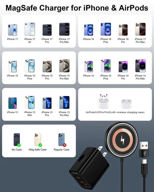 Compatibility: iPhone 12/13/14/15/16/17 Series, AirPods Pro (4/3/2) with Wireless Charging Case