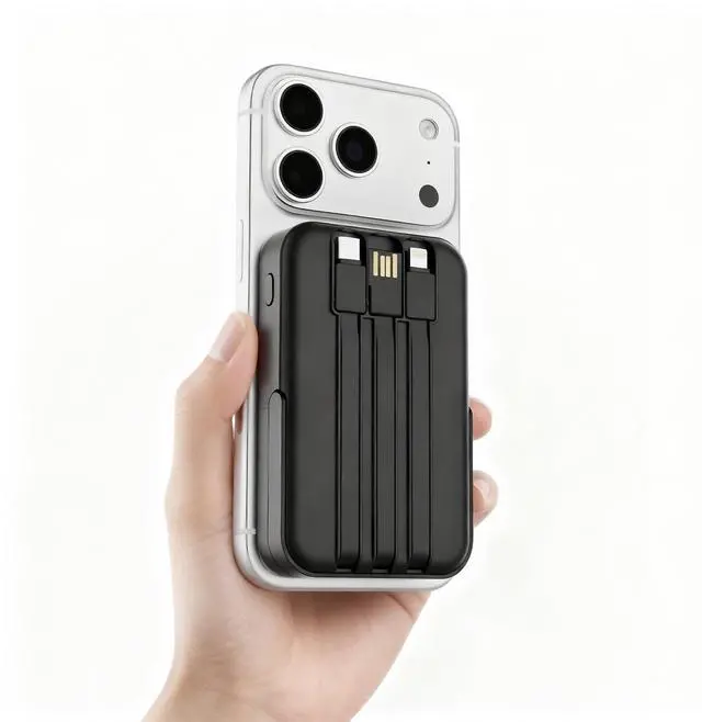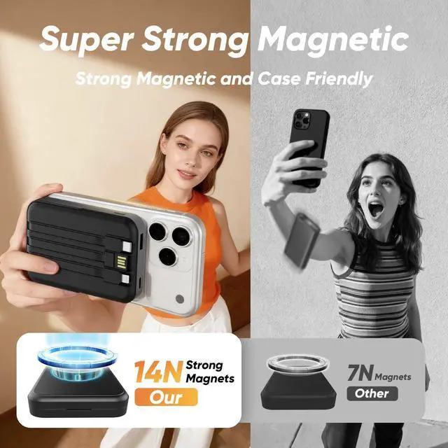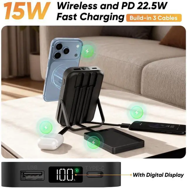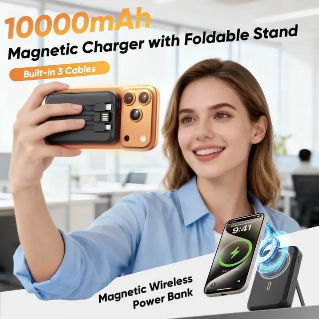 Large capacity The 10000mah super large capacity charger bank can provide lasting and stable battery power for electronic devices, which is very suitable for other daily and outdoor activities. Wireless Charging designed specifically for iPhone 16 / iPhone 16 Plus / iPhone 16 Pro / iPhone 16 Pro Max, iPhone 15 / iPhone 15 Plus / iPhone 15 Pro / iPhone 15 Pro Max, iPhone 14/ iPhone 14 Pro/iPhone 14 Pro Max/iPhone 14 Plus, iPhone 13/ iPhone 13 Pro/iPhone 13 Pro Max/iPhone 13 Mini, iPhone 12/ iPhone 12 Pro/iPhone 12 Pro Max/iPhone 12 Mini. Built-in 3 Cables (1* Lightning output, 1*Type-C output, 1*USB-A input). Powerful Safety Protection This solar power bank has good build quality and safety protection system. Short circuit, overtemperature, input overvoltage and output overcurrent protection let you use it at ease. Three Devices Charging Simultaneously This magnetic wireless power bank is designed with 3 outputs: 1*Type-C charging outputs, 1*USB-A output, 1* Magnetic wireless output. It supports 3 devices charging max simultaneously, no more cluttered charging adapters or cables on your desk now. Wireless Charging For iPhone 16/15/14/13/12 Series, Type-C & USB-A For all phone/Tablet/earbuds and more. Strong Magnetic and Case Friendly Magnetic portable charger adopts the latest magnetic suction technology, charging immediately after snap. Support 5W, 7.5W, 10W and 15W Max wireless charging. To better enjoy this wireless power bank, we recommend charging with a Mag-Safe phone case or without cases to get enough suction for better grip. Note: Only for magnetic cases, does not for non-magnetic cases. Built-in foldable kickstand The portable power bank for iPhone with foldable kickstand, keeps your Phone on it vertical or horizontal for a comfortable viewing angle. Built-in 3 Cables This magnetic wireless Power Bank built-in 3 cables included 1*Type-C output, 1* Lightning output, 1*USB-A input, compatible with iPhone, Samsung, Android and tablets etc smart devices, directly charging in anywhere. Also built in USB-A input cable for charging power bank itself, you don't need take any cords when going out and travel. Compact and Portable The wireless power bank is lightweight and easy to carry, only 190g, it can be put in your pocket to carry to anywhere. It doesn't give too much bulk on the phone that you can put the phone in your pocket while charging with this magnetic power bank. Specifications: Capacity: 10000mAh Battery type: Li-Polymer Battery Type-C input: 5V/3A, 9V/2A, 12V/1.5A Type-C output: 5V/3A, 9V/2A, 12V/1.5A USB output: 5V/3A, 4.5V/5A, 5V/4.5A, 9V/2A, 12V/1.5A(MAX: 22.5W) Magnetic wireless output: 15W Material: ABS+PC Product size: 112*69*22mm Product weight: 190g Product color: Black/White
