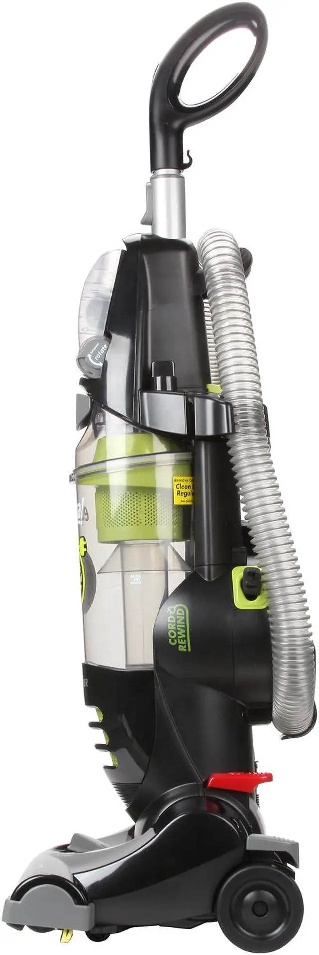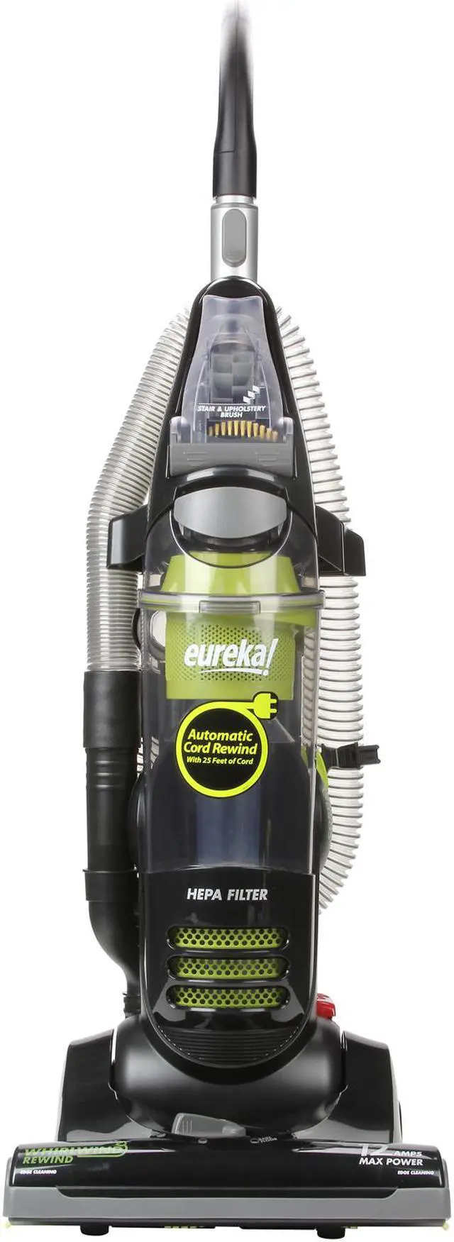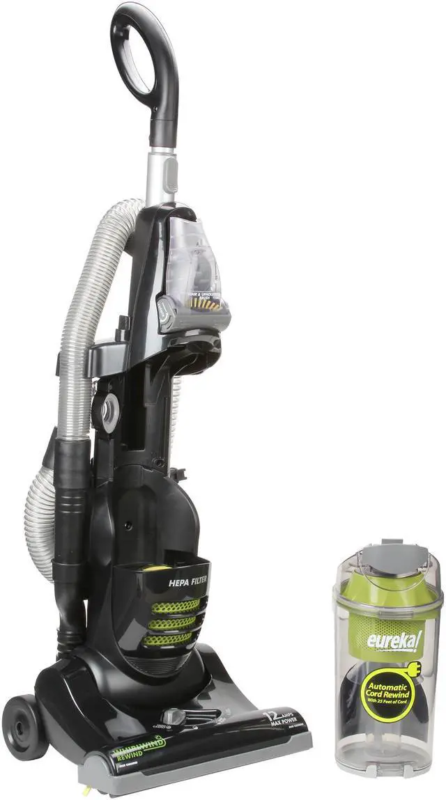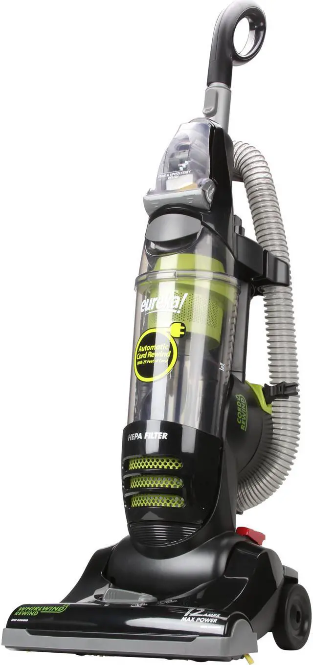The Eureka WhirlWind Rewind is tough on dirt pick up, with powerful cyclonic technology and a HEPA filter. Plus, the ergonomically designed handle and automatic cord rewind makes it easy on you.