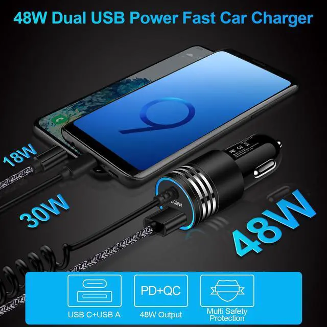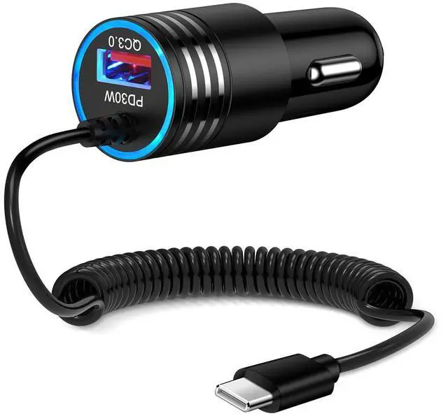 USB C Car Charger with Built-in 3ft Fast Charging Coiled Type C Charger Cord Fast Charge for iPhone 17/17 Pro Max/17 Pro/17 Air/16e/16/16 Pro Max/16 Plus