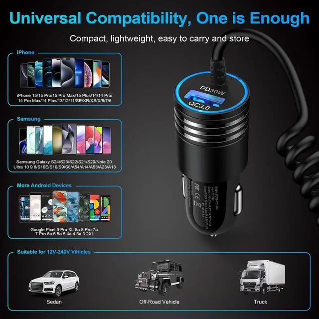 Each port of the car charger for iphone 16e can automatically detects the connected device to allow and peovide optimal charging, PD 3.0 30W Max and QC 3.0 18W Max, fast charging iPhone 16 15 series up to 80% in just 30 minutes, this means up to 50% faster charging for smartphones in your car with this iphone 16 pro max car charger adapter