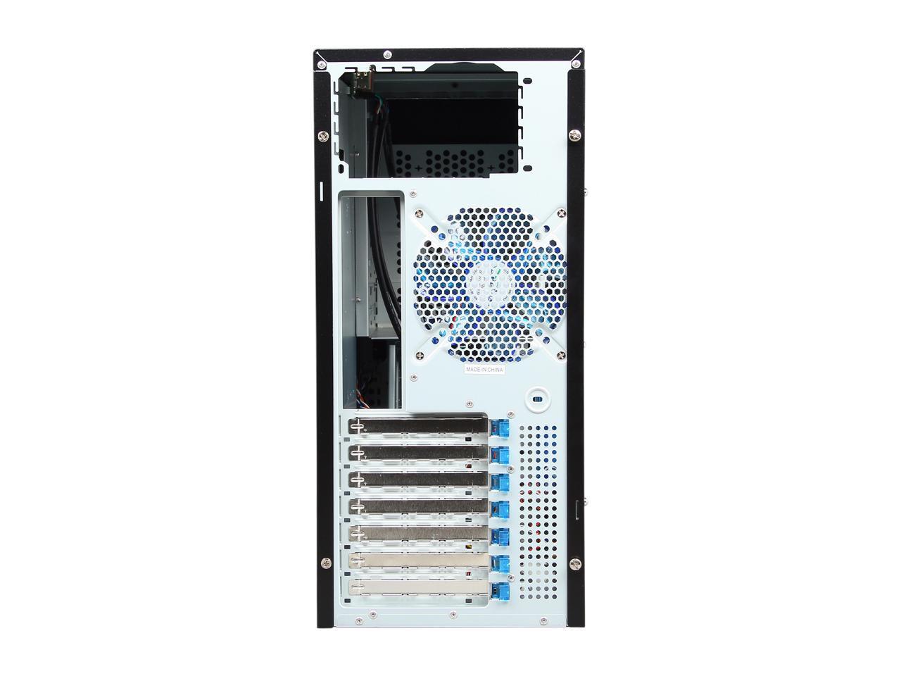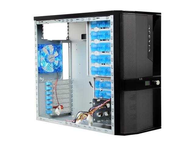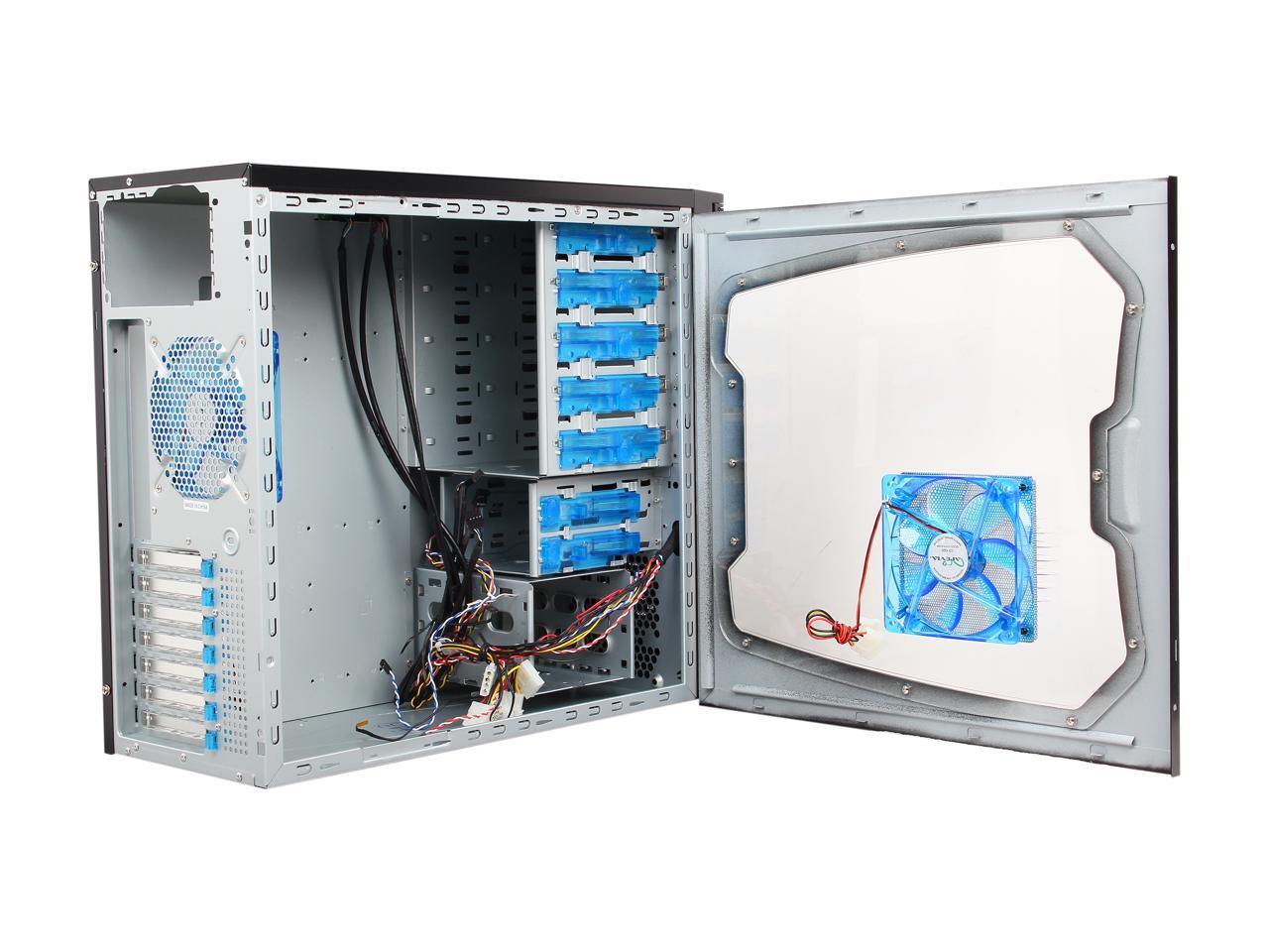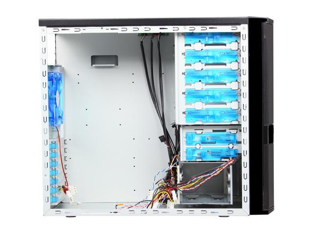 Ten drive bays and seven I/O slots give room for expansion, and a front panel LCD display tracks the internal temperature. Side 120mm fan with UV blue LED as well as 120mm rear fan keeps everything cool while illuminating the interior, and if they're not quite enough, you can add one more. You can also access your audio and your USB 2.0 from the front panel.