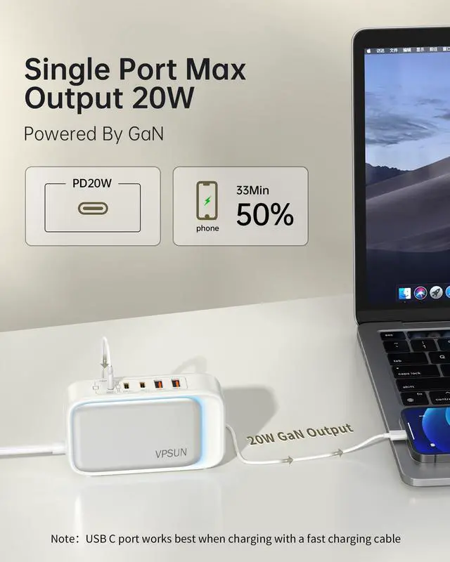 This Charging station uses GaN III technology, which is smaller and more powerful, It can charge the latest iPhone15 pro by more than 50% in 30min.