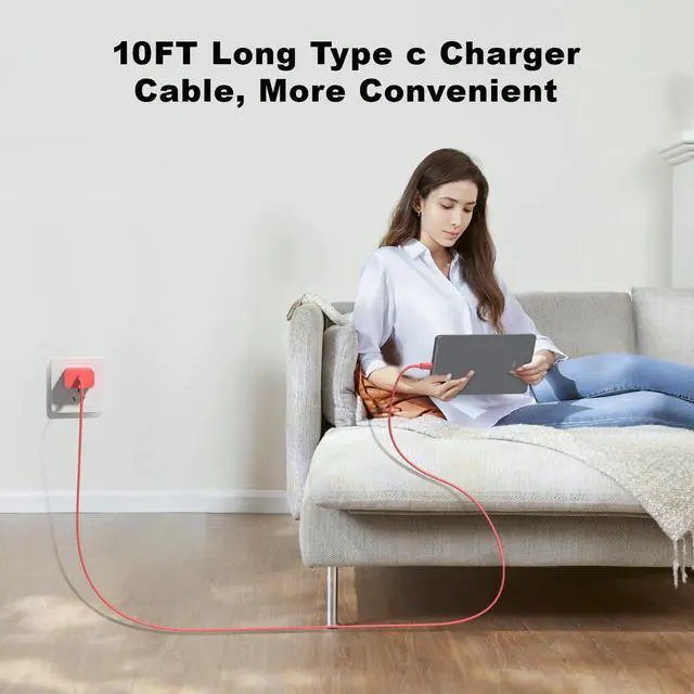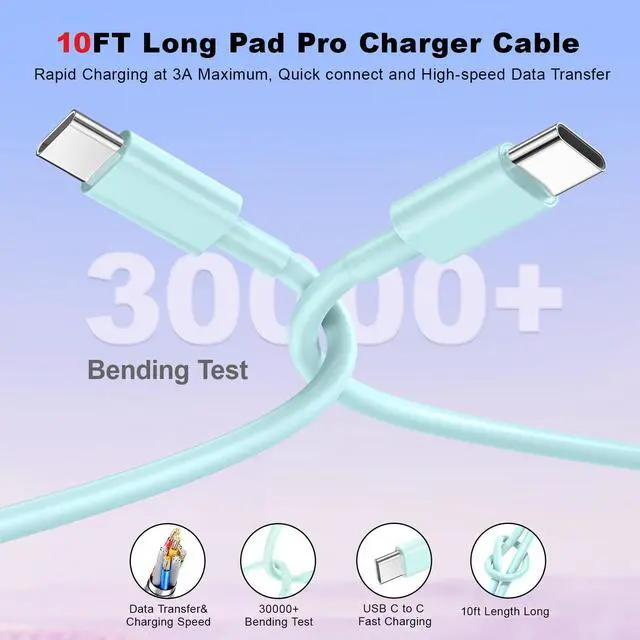 10FT USB C to USB C Charging Cord:This charger cable features a solid construction, and the charger cord is lab-tested to withstand 30,000 bends.Embrace the convenience offered by our 10FT long Type-C to C cable, perfectly tailored for your Pad Pro fast charging needs. Equipped with an intelligent chip, it ensures a rapid 3A charging speed. The cable's reversible design allows for effortless plug-in, while enabling efficient 480Mbps data syncing. With its generous 10FT length, you'll move your device around while keeping your device powered up.