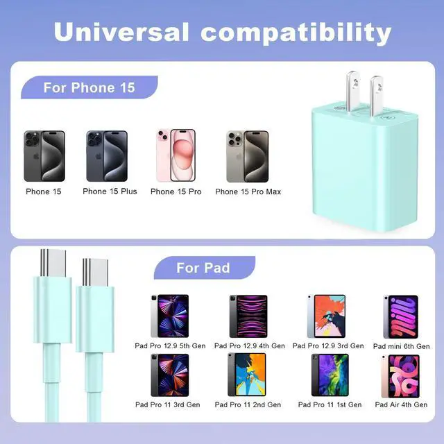 Superior Safety USB C Charger Fast Charging:Our USB C charger fast charging prioritizes safety with its comprehensive protection system, guarding against over-voltage, over-charge, and over-heating. With the smart chip,USB C to USB C cord equips automatic chip recognition function.Support 480Mbps Sync/Data transfer speed;100% flawless compatibility with Phone/Pad devices,it intelligently adjusts the current to match your device's needs, guaranteeing a rapid and secure charging process for your Phone15/Pad Pro.