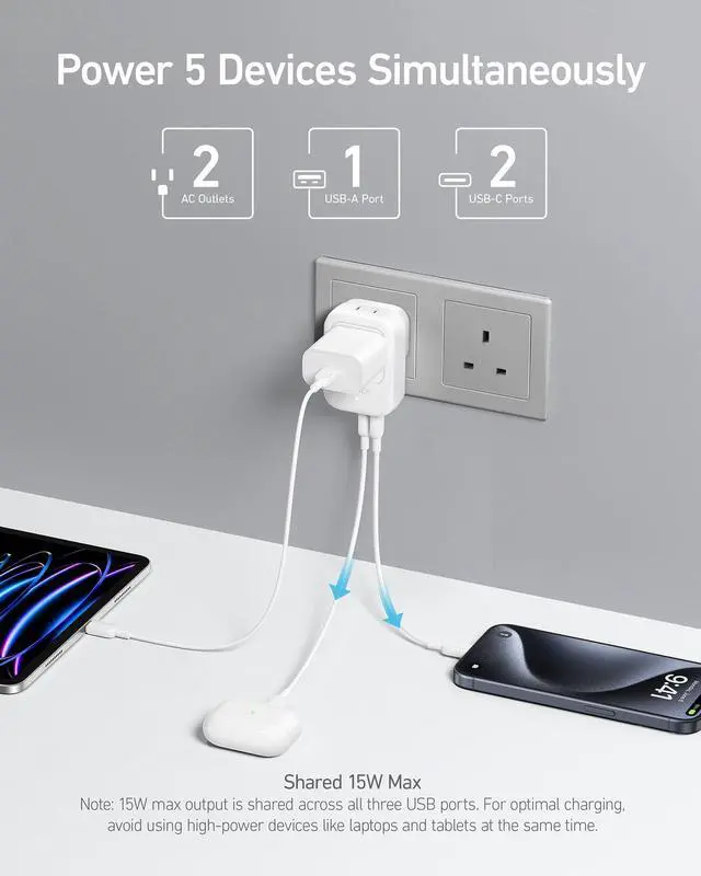 5 Devices, One Adapter: Effortlessly charge up to 5 devices with 2 outlets, 1 USB-A, and 2 USB-C ports, sharing a 15W max output, perfect for phones, tablets, and more.