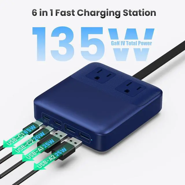 This usb c charger with 6 ports:2 USB-C ports, 2 USB-A ports, and 2 AC outlets, you can charge 6 devices simultaneously, All usb ports support advanced PPS,PD3.0 and QC4.0 technology.