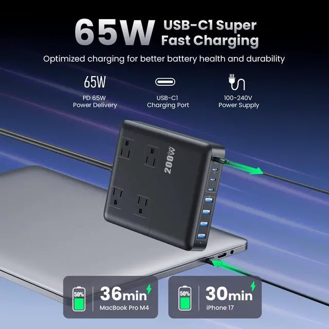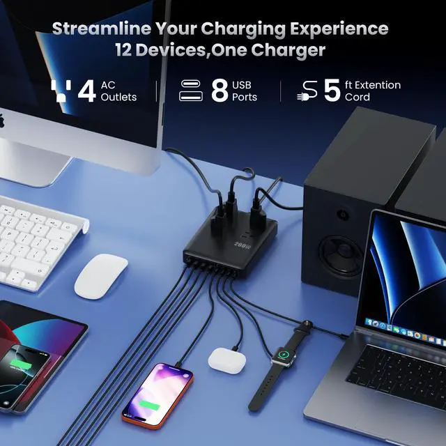 Transform your workspace into a command center. The 12-in-1 Charging Station combines 4 AC outlets and 8 USB ports into one ultra-compact device. With a massive 200W shared output, it’s the only power strip you’ll need to juice up your MacBook, iPhone, iPad, and more—all at the same time.