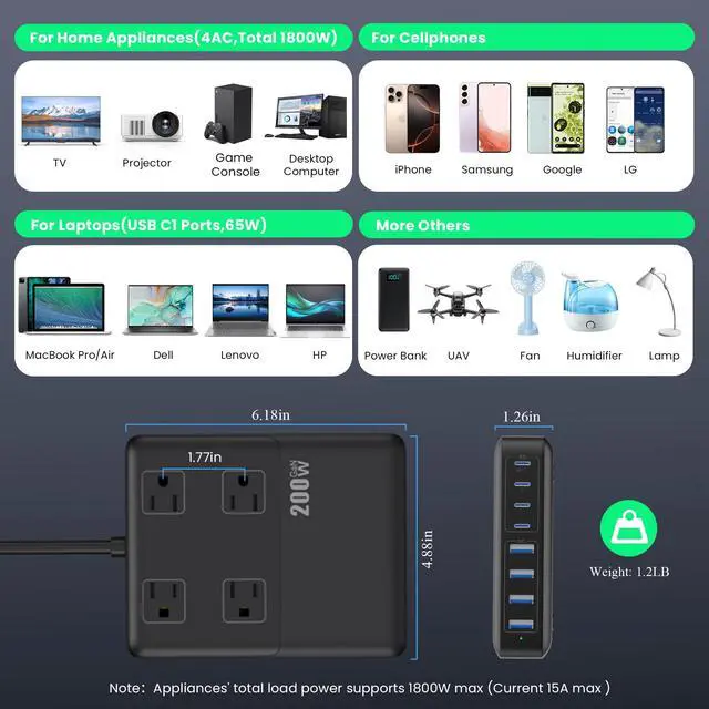 - 4 AC Outlets + 4 USB-C + 4 USB-A Ports, 12 Ports charge up to 12 devices at once. Total 200W power output for phones, laptops, tablets, and home appliances, Perfect for family, office, dorm, and travel.