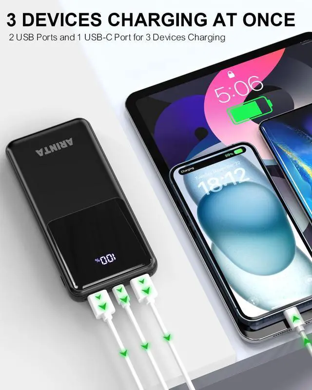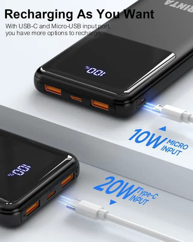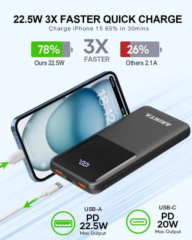 Power Bank PD22.5W, USB-C In/Out, LED Digital Display, Slim and Lightweight.
