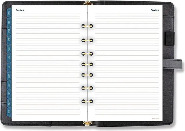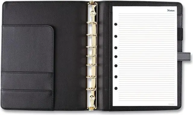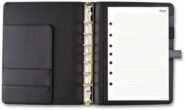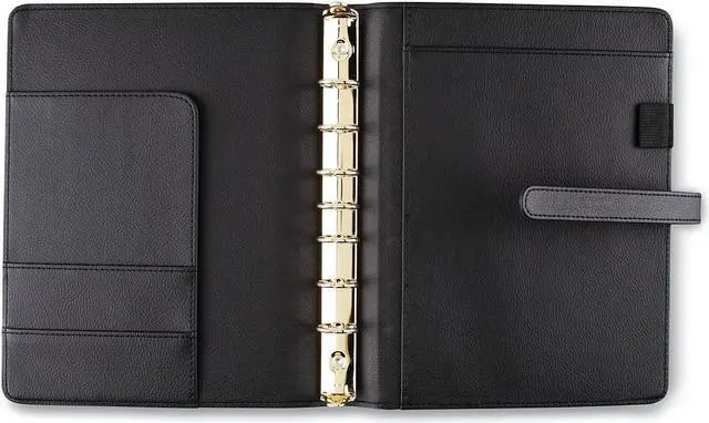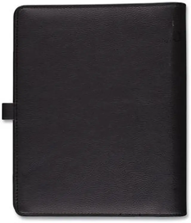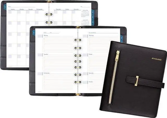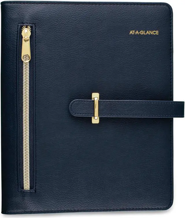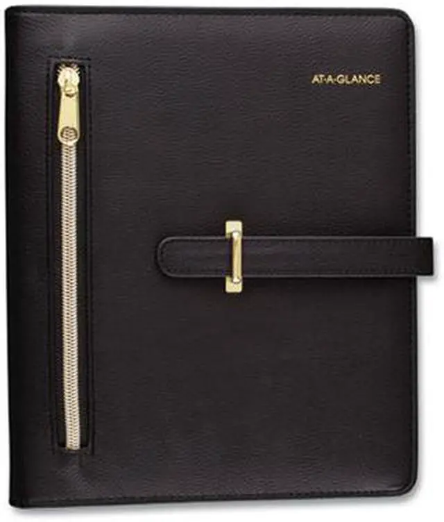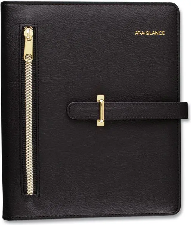 Luxurious and fashionable faux leather cover features an exterior zipper pocket and a buckle closure. Planner includes undated 12-month tab set, 16 undated weekly pages and 24 notes pages to start planning anytime. One week per two-page spread has ruled planning space with hourly appointment times from 8 a.m. to 5 p.m. One month per two-page spread has open daily blocks with a shaded area to write in the date. Each month is tabbed and future year reference calendars are displayed. Desk size starter set (size 4) with a 8.5" x 5.5" page size. Organizer cover is binder style with seven, 3/4" gold rings so pages stay secure. Starter set accessories include a zippered pouch, page marker ruler and 24-sheet note pad. Dated/Undated: Undated; Calendar Format: Weekly; Monthly; Page Format: One Week per Two-Page Spread; One Month per Two-Page Spread; Academic Year: No.
