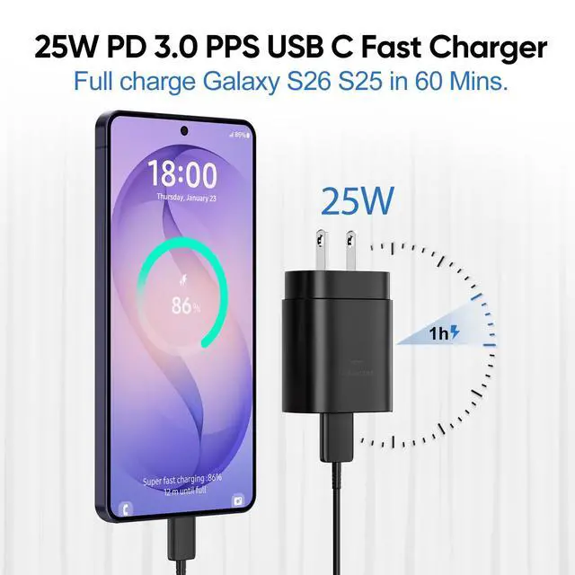 25W Samsung Fast Charger: This 25W Type C charger kit supports multiple fast charging technology, Samsung super fast charging PD 3.0, PPS, and QC 4.0. It provides fast charging up to 25W output, super fast charging for Samsung galaxy S26 Ultra, S26, S25 Ultra, S25, S24 Ultra, S24, S24+, S23, S23 Ultra, S23+,S22, S22 Ultra, S22+, S22 Plus, z fold3 5G, z flip 3, S21, S21 Ultra, S21 Plus, Note 10 and more. You can charge your Phone to 60% in just half an hour, 5 times as fast as standard USB C wall charger