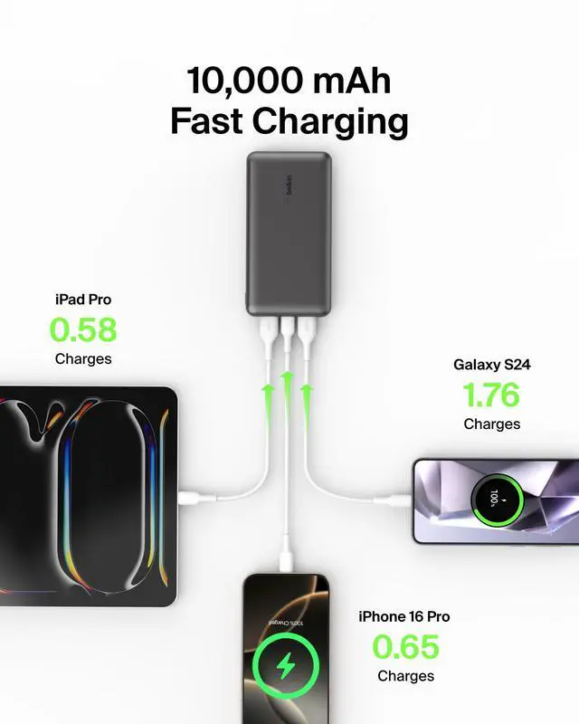 • 3 PORT FAST CHARGING: This BoostCharge power bank lets you simultaneously charge up to 3 devices with a USB C port and 2x USB A ports. Get a fast, dependable charge to your iPhone, Android, and other compatible devices.