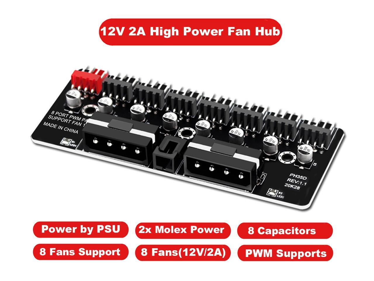 8 Ports 12V/2A High Power Chassis Fan Hub,4 Pin PWM CPU Cooler / Case / Chasis Cooling Fan Power Cable Splitter Adapter w/Self-sticker,Power by Dual Molex,Compatible with 3pin & 4pin Fans