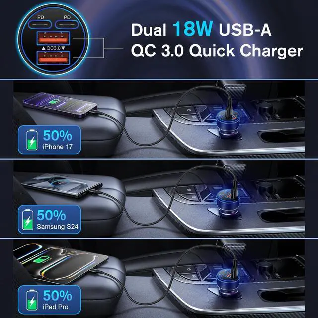 Canjoy USB C Car Charger can charge iPhone 17/16/15 series to 80% or iPhone series to 80% in 35 minutes