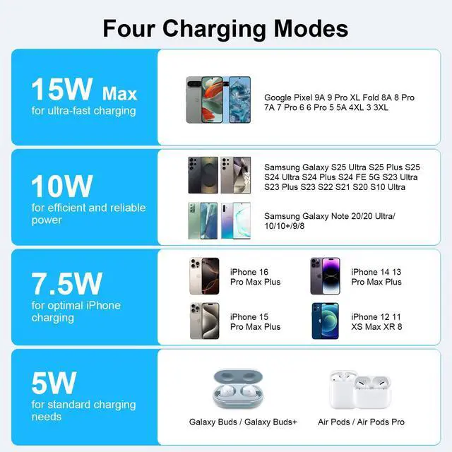 • Wide Compatibility: Samsung galaxy s25 ultra charger provides 15W max fast charge. 15w charge mode for Google Pixel 9A 9 9 Pro 9 Pro XL 9 Pro Fold 8 Pro 8 7A 7 7 Pro 6 6 Pro.10W fast charging for Samsung Galaxy S25 S24 S23 S22 S21 S20 S10 Ultra FE 5G Plus Z Fold Flip 6 5 4.7.5W google wireless charging mode for iPhone 16E 16 15 14 13 12 11.5W standard charge mode for using wireless charger devices.