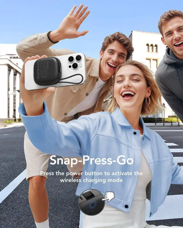 Please attach your device and the power bank together first, and then click the power button to start wireless charging.