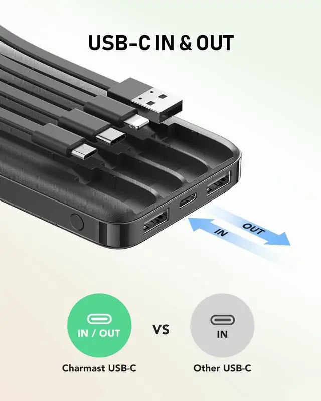 Recharge it by Built-in Cable No need for an extra cable; no more hassle of finding for a charging cable | Recharge it by Type-C Input You need to use your additional cable to recharge your power bank | Recharge it by Micro Input You need to use your additional micro cable to recharge your power bank |