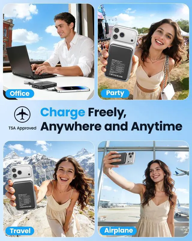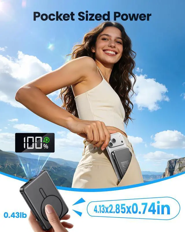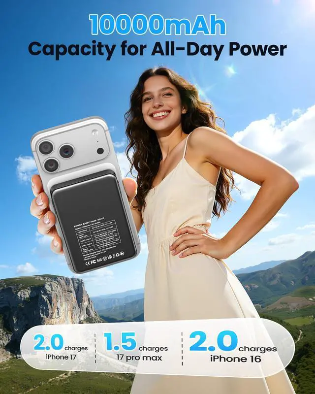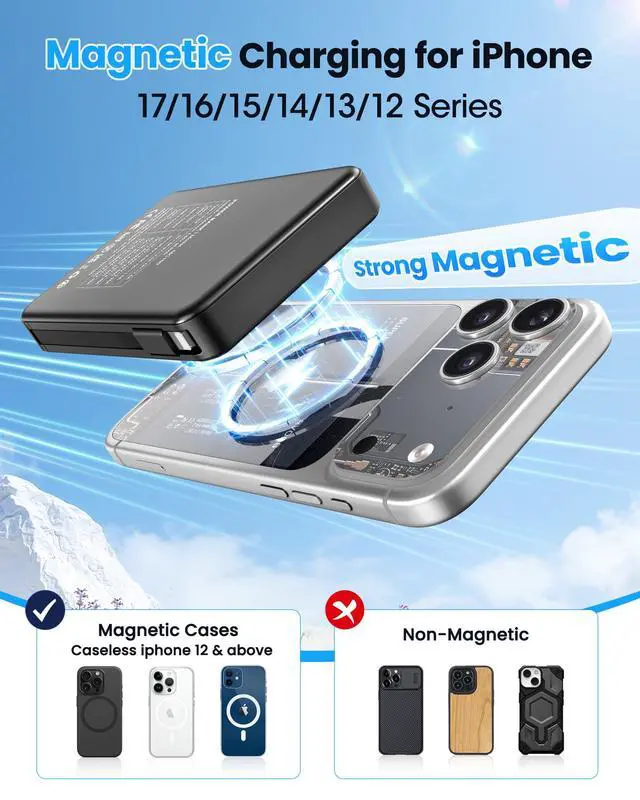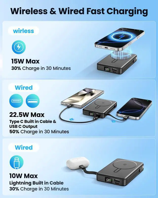 for Magsafe Battery Pack 10000mAh 10000mAh Magnetic Power Bank:Say goodbye to battery anxiety! --- Two Options Charging: -Port:Type-C(Input&Output) & USB-A Output -Built-in Cable:Type-C Output & Lightning Output -Wireless Output --- What's in the box: 1 x 10000mAh portable charger 1 x USB-C charging cable 1 x User manual ---High Capacity in a Compact Body With a 10,000mAh battery, this power bank delivers reliable power to keep multiple devices charged throughout the day. Compatible with iPhone 17/ 16/15/14/13/12/11/X/8 Pro/Max/Plus and it is also Compatible with other phone like Samsung S23,S22,S21,S20, Google, Pixel, Android, iPad, Tablet and more with type C Cable . Despite its high capacity, its designed to be lightweight and portable, easily fitting into your bag or pocket. Perfect for travel, work, or daily commutes, it ensures you stay connected and productive without the extra bulk. A great balance of power and portability for users on the go. Fast and Efficient 20W Charging Equipped with powerful 20W fast-charging technology, this portable charger significantly cuts down charging time. Quickly charge smartphones, tablets, and other devices without long waits. Compatible with various devices and brands, it offers stable and efficient power delivery every time. Ideal for busy users who need their devices ready to go at all times. Stay powered and save time with faster charging speed.Charge Up to 5 Devices at OnceDesigned for multi-device users, this power bank features five output ports, allowing you to charge up to five devices simultaneously. Whether it's your phone, earbuds, smartwatch, or tablet, power them all at once without compromising speed. Compatible with iPhone 17/16/15/14/13/12 Pro/Max/Plus and more. The single input port supports fast recharging, so youre always ready to go with minimal downtime.Clear LED Digital DisplayStay informed with the built-in LED digital screen that shows real-time battery percentage. No more guessing how much charge is leftget accurate info at a glance. The clear, easy-to-read display helps you manage power usage and know exactly when its time to recharge. Whether at home or on the move, youll always know your charging status, making power management simple and stress-free.Advanced Multi-Level ProtectionYour safety is our priority. This power bank features comprehensive protection, including safeguards against over-temperature, over-current, short circuit, and more. These advanced safety features protect both your devices and the power bank itself, ensuring safe and reliable charging. With smart protection built-in, you can charge confidently, knowing your devices are secure every step of the way.