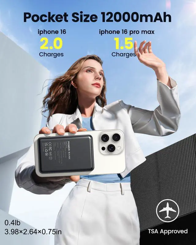 • 12000mAh High Capacity Power Bank: This 12000mAh magnetic power bank can provides about 2 charges for iphone 16 pro. Whether on a trip, at work, or engaged in outdoor activities, the 12000 mAh capacity providing enough power for your devices without the constant worry of battery depletion