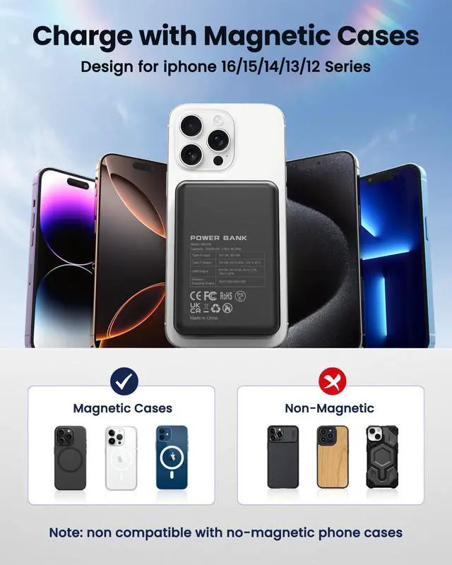 • Great Compatibility Power Bank for iPhoneThis magnetic portable charger is designed for iPhone 16/15/14/13/12 series. Note: For best magnetic alignment, use with MagSafe-compatible cases or no case (Airline-approved)