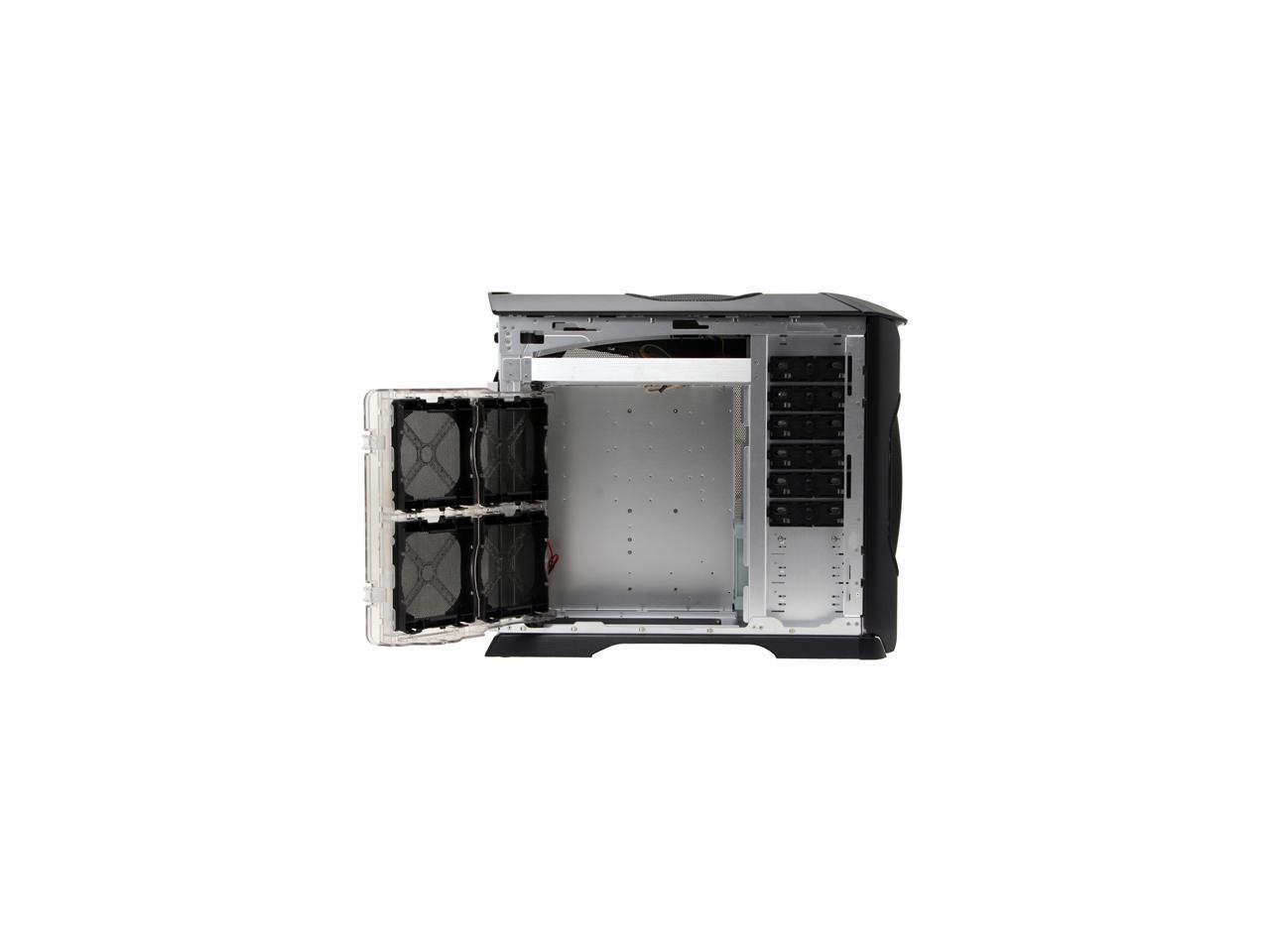 Internally this case is just as business like. The hard drives are well represented with four 3.5" bays. The cooling of this tower is where it truly shines however. It comes with two 120mm fans for use in the front and back, and then goes overboard with slots for an additional four 120mm fans on each side. When used in combination, there is very little that these fans can’t keep cool. The optional fan on top is an after thought that only the most die hard of users will ever need.