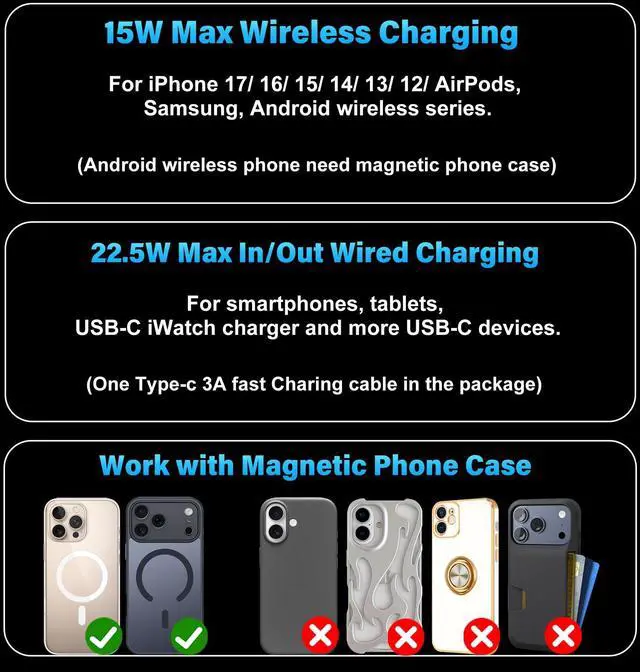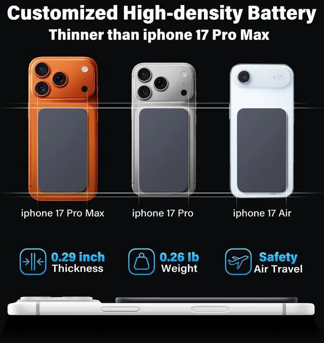 | Special Feature | 0.29" Thin Slim, 0.26Ib Lightweight, 15W Max Magnetic Wireless Charging, 22.5W Max USB-C In/Out Port Fast Charging, Advanced Temp Control System, Multiple Protections |