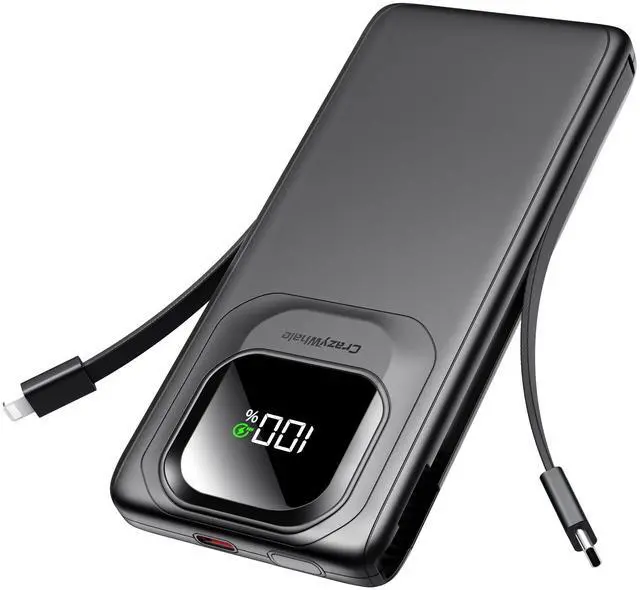 Portable Charger Power Bank with Built-in Type C Cables, 22.5W Fast Charging 10000mAh Phone Charger, Travel Battery Pack Slim Battery Bank with LED Display for iPhone, Android & USB-C (Black)