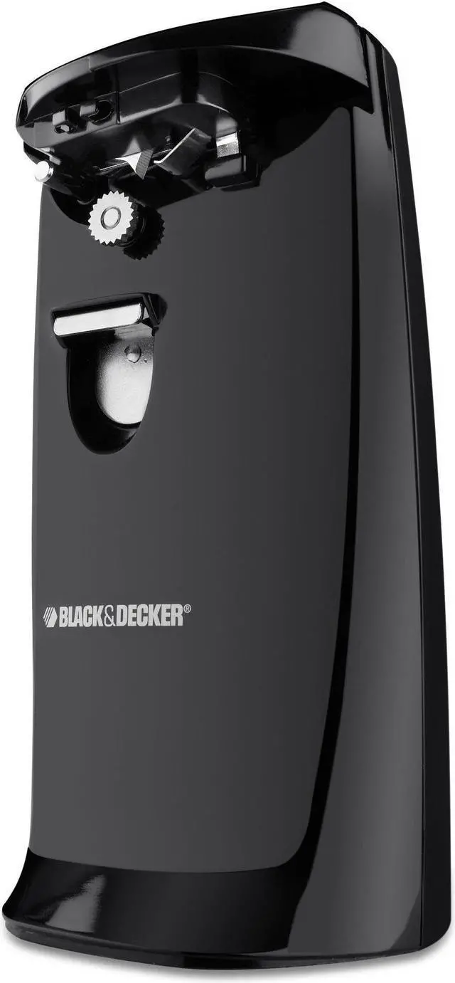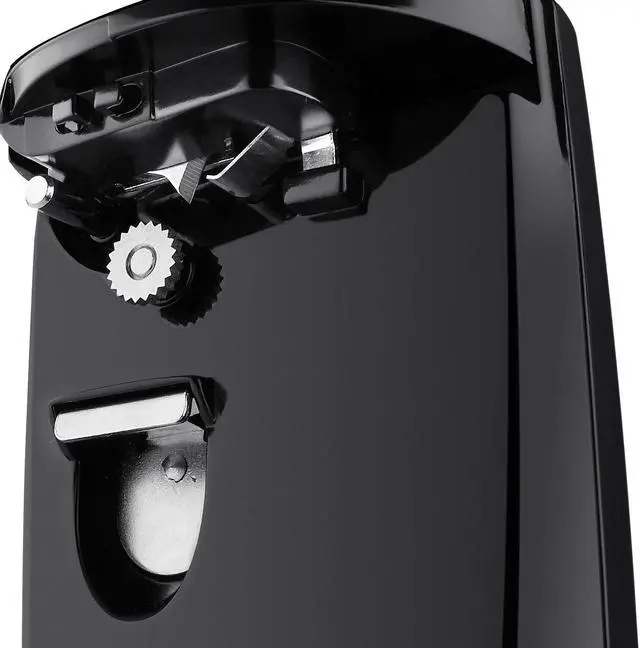 Extra-tall electric can opener accommodates cans up to 49.5 oz. Power pierce cutter easy-touch lever for efficient hands-free operation. Automatic shut-off function removable blade convenient cord storage. Includes built-in knife sharpener pop-top opener and bottle opener. Measures approximately 4.5in x 6in x 9.888in.