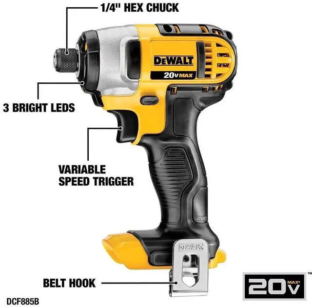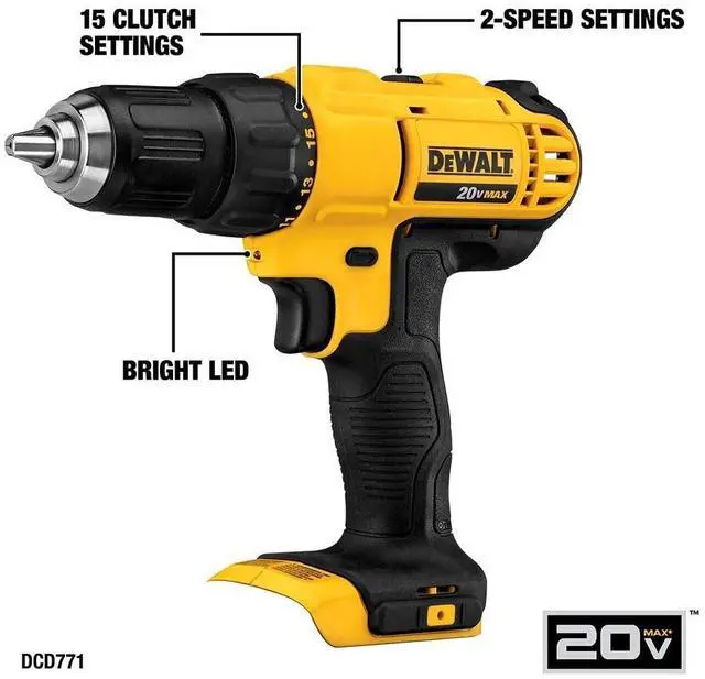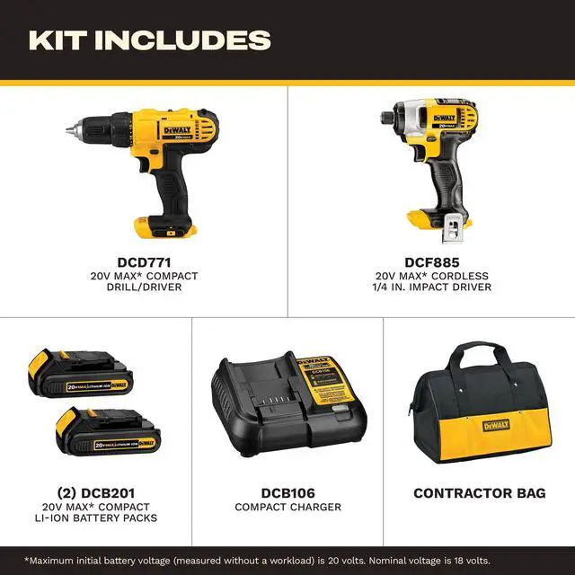 Both the DEWALT impact driver and electric drill driver feature integrated LED work lights with a convenient 20-second delay, ensuring enhanced visibility in dimly lit or challenging work areas
