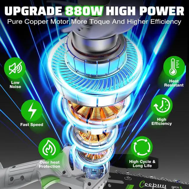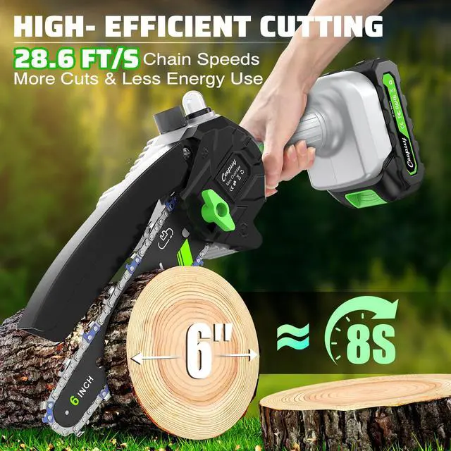 Upgraded High-Efficiency Pure Copper Super MotorCeepuy 6-inch cordless mini chainsaw boasts an 880-watt high-power motor. 28.6 FT/s high speed can efficiently cut a 6-inch diameter log in just 8 seconds, significantly reducing cutting time. Ideal for both home and work, it effortlessly fells common trees or large logs with ease and efficiency.