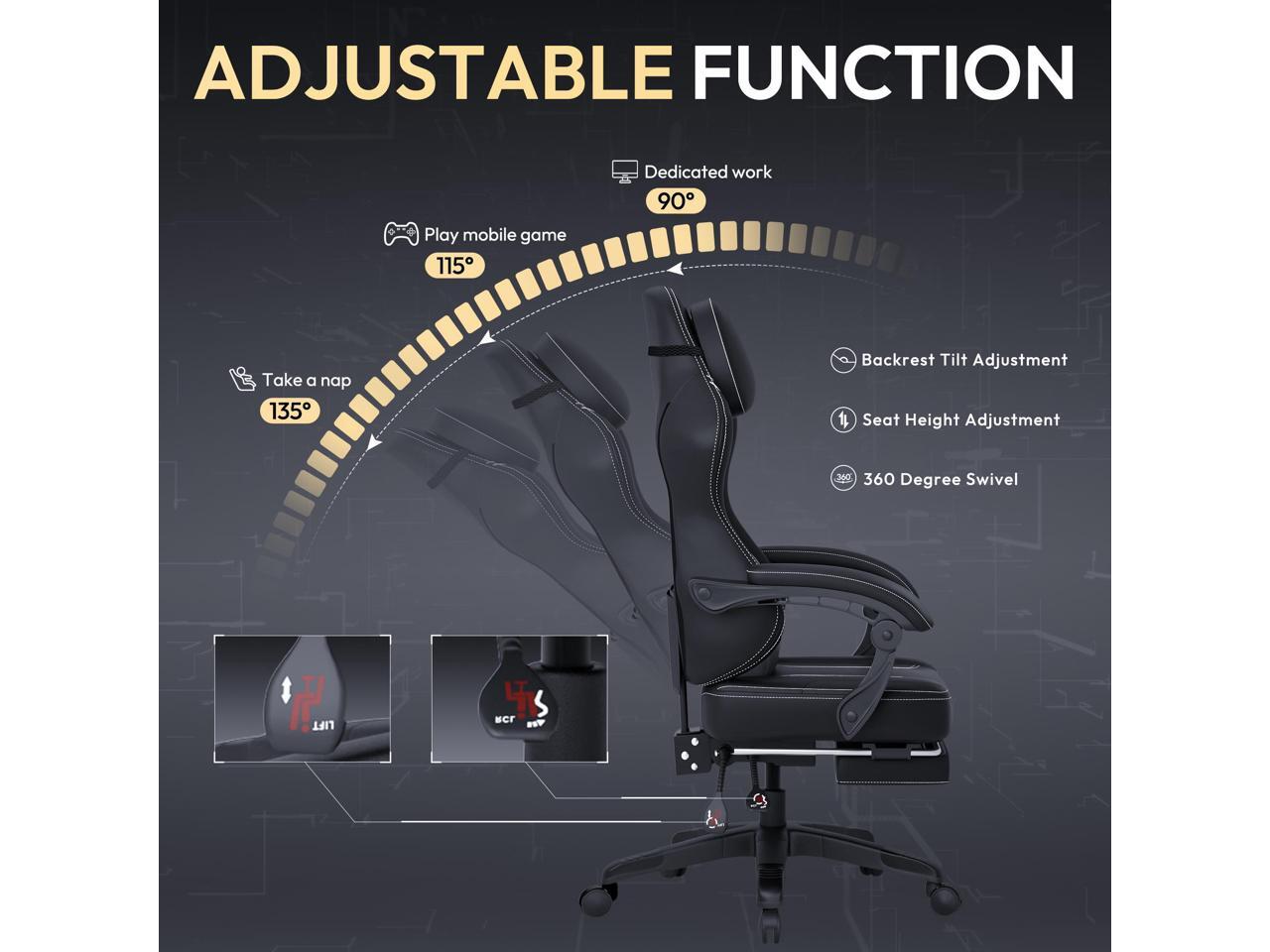 - [Ergonomic Design for Extended Gameplay]: Tailor your seating experience with an adjustable backrest that reclines from 90 to 135 degrees, coupled with a retractable footrest. This feature enables you to find the perfect angle for gaming, streaming, or resting, offering a stable and comfortable foundation for every activity.
