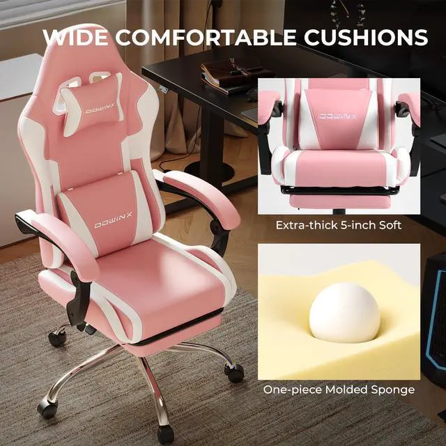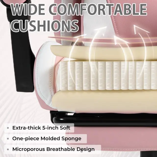 Upgrade your setup with a true Ergonomic gaming chair built for marathon play and long workdays. This Gaming chair with footrest features a soothing massage lumbar support, spring-cushion seat and adjustable headrest to relieve back strain during intense esports tournaments, streaming sessions, or late-night study and work. Engineered as a heavy duty gaming chair, it supports up to 330lbs on an aluminum five-star base with SGS-certified gas lift and smooth castersoffering the stability shoppers expect when browsing for a Big and tall gaming chair alternative. The 150° reclining backrest and adjustable height let you switch effortlessly from focused play to relaxed breaks. Unlike plain PU models, our breathable mesh gaming chair design blends premium leather with ventilated mesh panels for airflow that prevents overheating during long sessions. For buyers searching enhanced adjustability like a 4D armrests gaming chair, our chair delivers multiple customizable support points (height, recline, headrest, lumbar) for a tailored fit. If youre comparing value searches such as gaming chair under $200, this model offers a strong price-to-feature ratio versus basic alternatives. While some shoppers look for a gaming chair with speakers or a Pink gaming chair, this versatile racing-style esports chair fits pro setups, home offices, dorms, and streaming studiossolving common pain points: poor lumbar support, flat cushions, overheating, and instability.