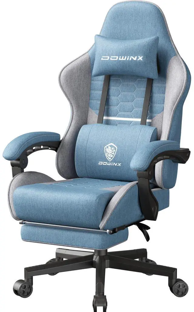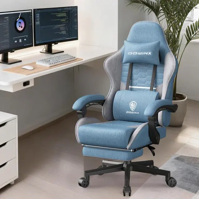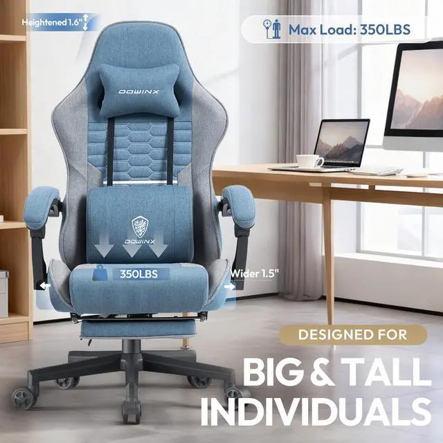 Dowinx Gaming Chair Fabric Big and Tall with Pocket Spring Cushion, Massage Game Chair Cloth with Headrest, Ergonomic Computer Chair with Footrest 350LBS, Blue Grey