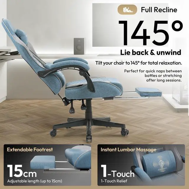 Easy but Abundant Functions: This gaming chair has a reclining function of 90°-145°. It is also combined with the footrest, it can be used for gaming, working and napping. And the headrest can be placed at the hollow or the top of the backrest according your height. The waist cushion with massage can help user accelerate recovery from fatigue, and relieves the burden on the waist when sitting for a long time.
