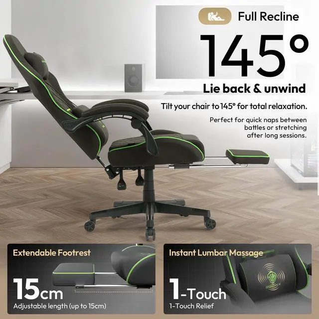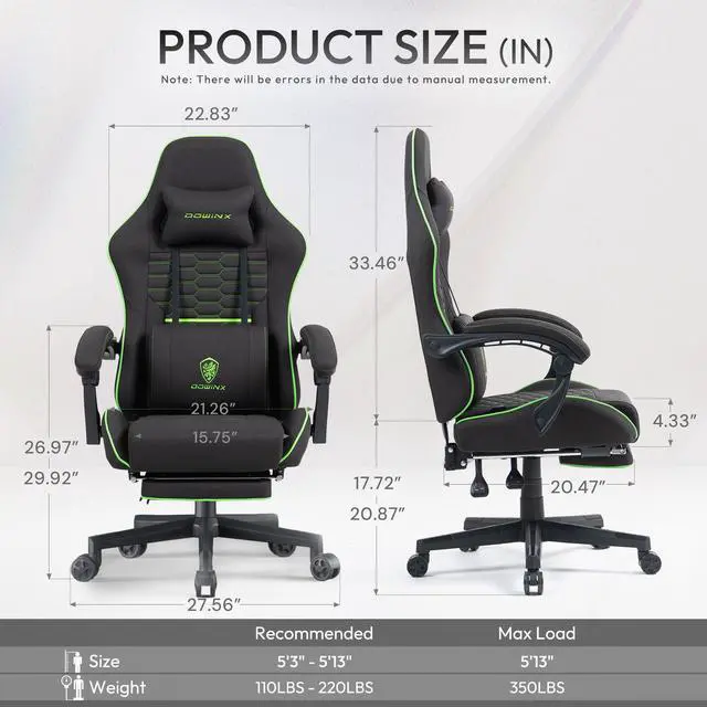 Easy but Abundant Functions: This gaming chair has a reclining function of 90°-145°. It is also combined with the footrest, it can be used for gaming, working and napping. And the headrest can be placed at the hollow or the top of the backrest according your height. The waist cushion with massage can help user accelerate recovery from fatigue, and relieves the burden on the waist when sitting for a long time.
