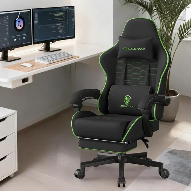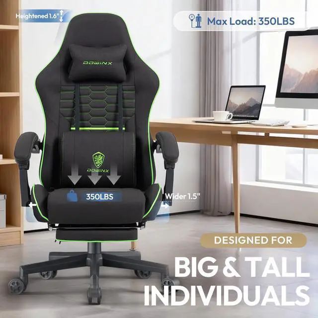 Dowinx Gaming Chair Fabric Big and Tall with Pocket Spring Cushion, Massage Game Chair Cloth with Headrest, Ergonomic Computer Chair with Footrest 350LBS, Black Green
