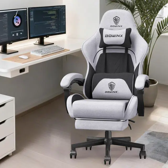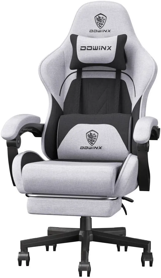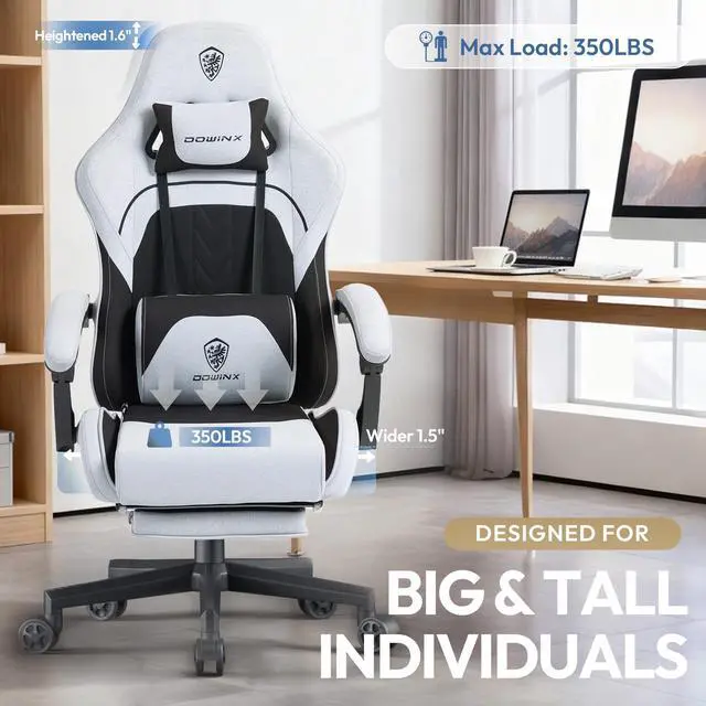 Dowinx Gaming Chair Fabric Big and Tall with Pocket Spring Cushion, Massage Game Chair Cloth with Headrest, Ergonomic Computer Chair with Footrest 350LBS, White