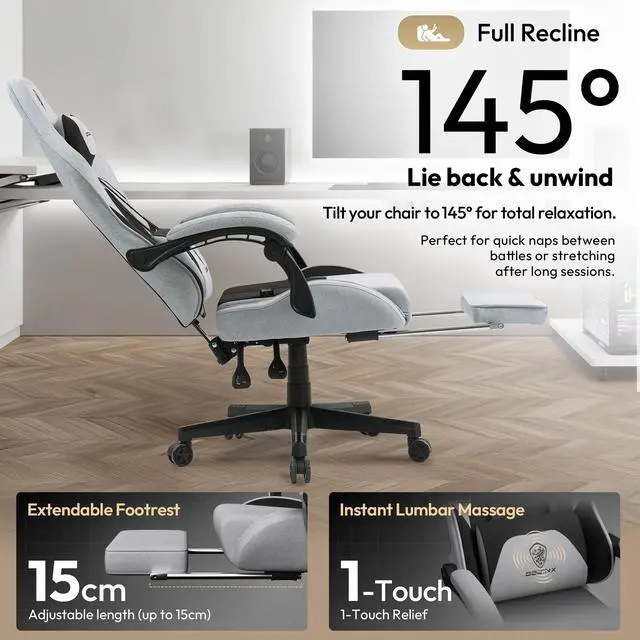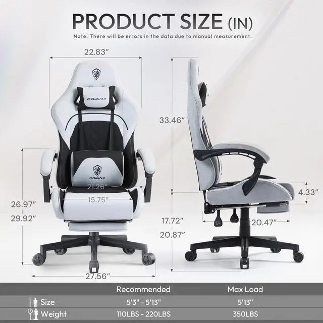 Easy but Abundant Functions: This gaming chair has a reclining function of 90°-145°. It is also combined with the footrest, it can be used for gaming, working and napping. And the headrest can be placed at the hollow or the top of the backrest according your height. The waist cushion with massage can help user accelerate recovery from fatigue, and relieves the burden on the waist when sitting for a long time.