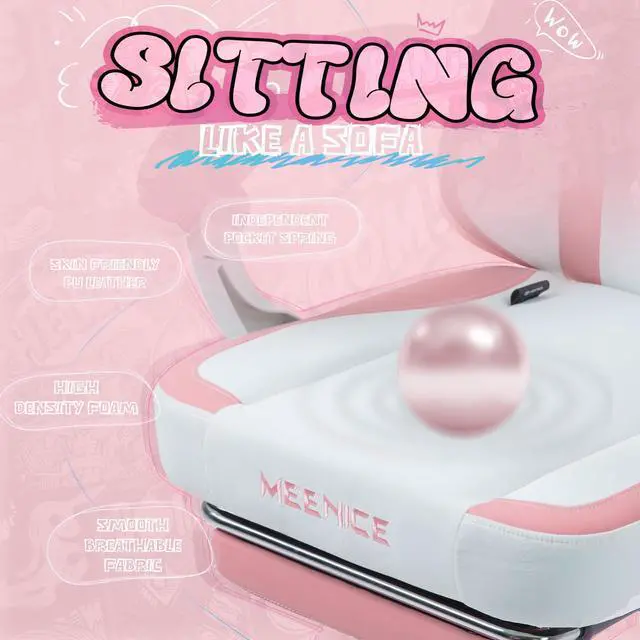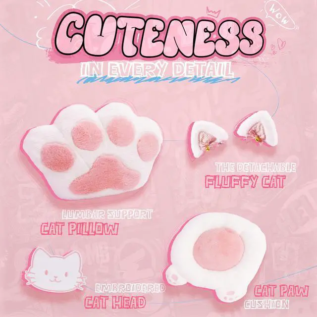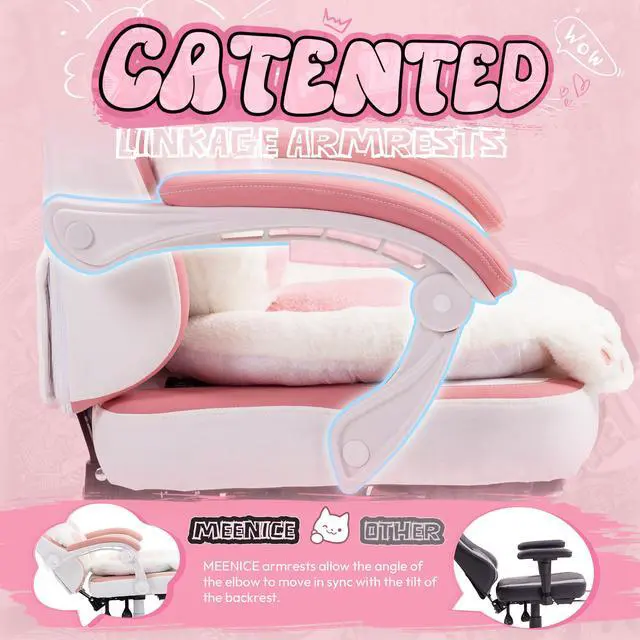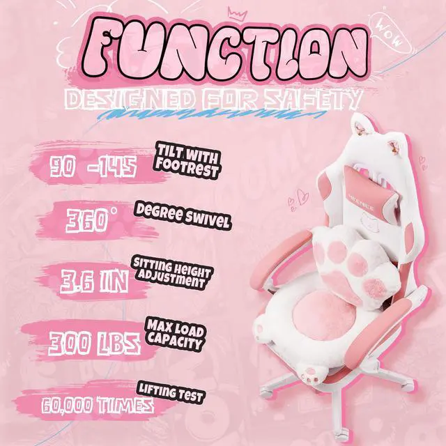 This gaming chair combines ergonomic support with playful design, featuring a cat-paw seat, detachable cat ears, and a high-resilience cushion. It offers 145-degree recline, synchronized armrests, and a retractable footrest, all covered in breathable fabric. The steel-frame backrest supports over 200 lbs. Comes with 24/7 support, 1-month replacement, and 1-year warranty.