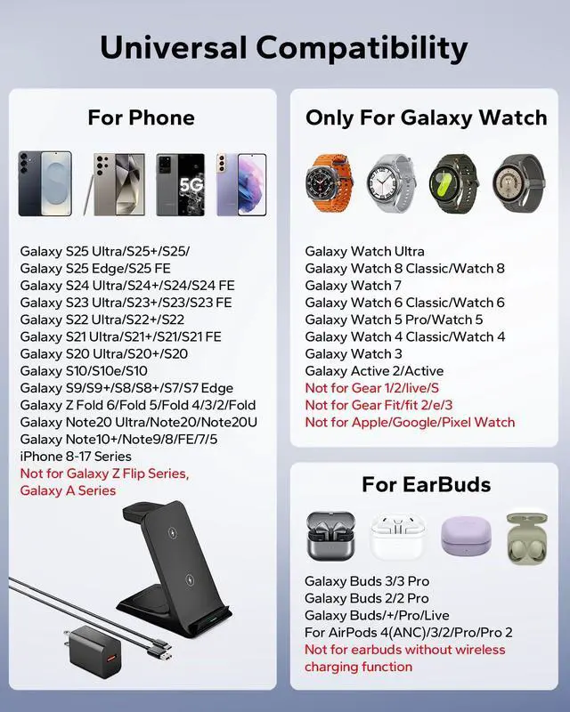 Samsung Galaxy phones (primary focus), Google Phones, iPhone 17-8, other Qi-enabled phones.