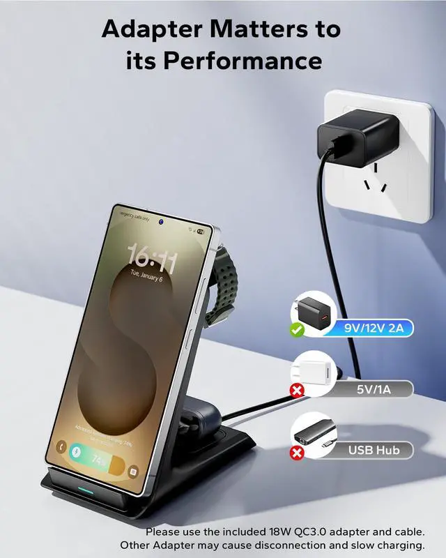 This charging dock can quickly charge Samsung phones and galaxy watches. Therefore, we recommend using QC 3.0 fast charger adapters for better charging performance.